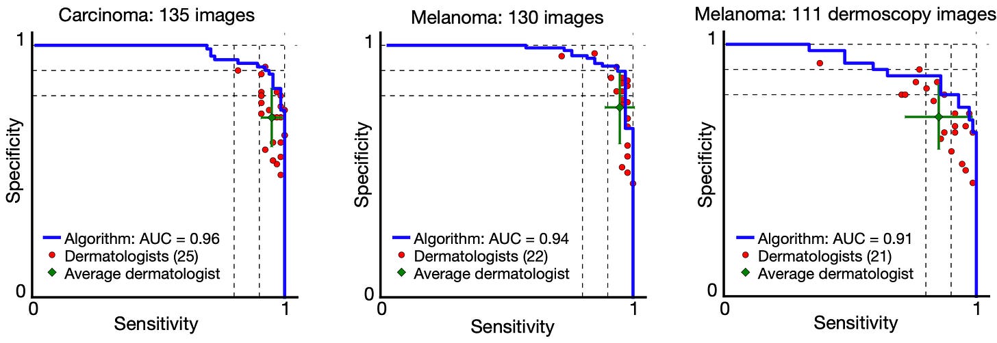 Their CNN was tested against 21 board-certified dermatologists on two critical tasks: identifying common keratinocyte carcinomas and identifying deadly malignant melanomas. As shown in the paper’s receiver operating characteristic (ROC) curves, which plot the trade-off between sensitivity (finding all cancers) and specificity (not misidentifying benign lesions), the CNN’s blue performance curve envelops the individual performance points of nearly all the human experts. The algorithm achieved performance on par with dermatologists.