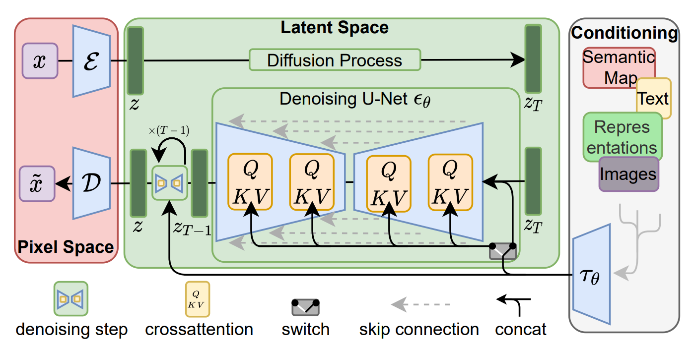 The network needs to keep the rough layout and shapes, as well as the more local edges, textures, and small details consistent at once. This is what the U-Net architecture is good at. It can first compress the image representation to capture context, then expands it back to recover detail, and use skip connections to carry high-resolution information forward so it doesn’t lose the sharper details. That’s why U-Net style denoisers sit at the core of diffusion systems like Latent Diffusion and Stable Diffusion.
