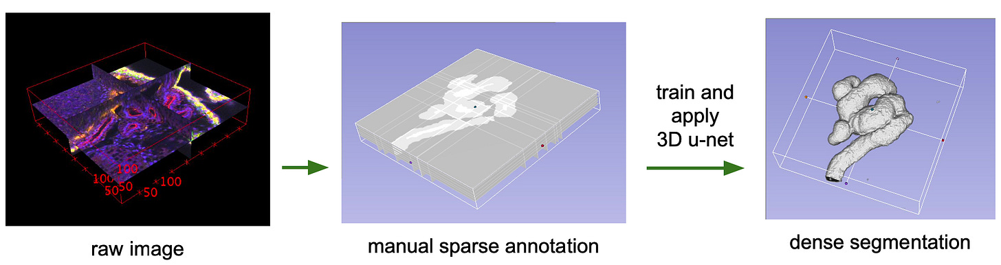 However, biomedical imaging presented unique constraints that the streets did not. Medical datasets are noisy, boundaries can be faint, they’re expensive to acquire and challenging to annotate. Every cell boundary, every membrane, every nucleus is traced by expert hands. While ImageNet contained millions of labeled images, biomedical researchers might have tens of images.