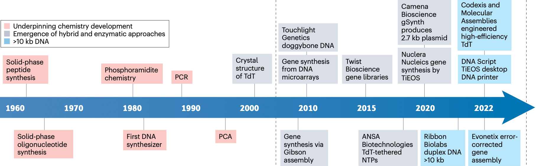 Newer enzymatic and hybrid approaches are pushing past chemical limitations by using enzymes like Terminal Deoxynucleotidyl Transferase, a DNA polymerase isolated from calf thymus that was discovered in the 1960s. These methods are capable of generating longer fragments at the kilobase length. Ansa even recently introduced up to 50kb clonal synthesis starting at 28 cents per base pair with turnaround times less than 25 business days.